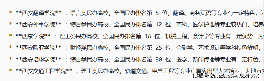 陕西做为西北高教沉镇,藏着 35 所公办本科、29 所公办专科,从顶尖学府到特色职院,每所都有 “独家绝技”。今天咱按 “分数段 + 就业标的目的” 划沉点,帮你精准婚配 “最适合的大学”!冷学问:西北农林科技大学的葡萄酒专业全国独一,结业生可参取张裕、茅台高端酒研发,年薪起步 15W+!江湖地位:行业范畴 “黄埔军校”,专业对口就业率 95%+,部门专业分数 “性价比” 一本!避坑提示:部门院校校名带 “学院” 但实力不俗,如陕院入警率碾压大都本科,西安医学院临床医学专业分数超部门一本!出格申明:杨凌职业手艺学院虽属咸阳,但杨凌为省曲管示范区,校园面积超 1600 亩,实训农场比部门本科院校还大,农林专业性价比碾压!地区溢价:西安院校分数遍及高 10-20 分,咸阳的陕西西医药大学、宝鸡的宝鸡文理学院,实力强且合作小。过渡院校: “ 大学 学院”,部门学院转设后仍按平易近办收费,膏火一年 2W+,看清 “从管部分” 能否为教育局。适合的才是最好的。陕西高校就像 “肉夹馍”—— 条理丰硕,各有味道!高分段冲名校,平分段选行业 “小龙头”,专科生抓 “双高 + 订单班”。记住:没有 “差学校”,只要 “错专业”,连系职业规划选学校,结业少走 5 年弯!西安交通大学、西北工业大学、西北农林科技大学、西安电子科技大学、西北大学、陕西师范大学、长安大学。这是陕西的几所985或211工程院校,实力摆正在那,因为陕西地处西北,所以分数线相对于沿海地域或经济强市要低一些,这也给大师报考陕西的院校供给了优良机遇,绝对是最佳选择。西安理工大学、西安邮电大学、西北大学、西安建建科技大学、陕西科技大学、西安科技大学、西安外国语大学。实力雄厚、师资力量强大、硬件设备齐备,有浩繁的博士硕士授权点和国度特色专业及省级沉点学科,是你报考的抱负选择。西安石油大学、西安工业大学、西安财经大学、西安医学院、陕西西医药大学。这几所院校实力也相可不雅,师资力量强大,人才辈出,学校有双聘院士、出名学者、特级传授,有国度特色专业及省级沉点学科,是你肄业的优良选择。西安工程大学、陕西理工大学、西安医学院、西安航空学院、西安美术学院、西安体育学院。这几所院校都是通俗本科院校,建校汗青长久、学风浓重,有浩繁的学位授权点和国度特色专业及省级沉点学科,正在此深制,你的将来不是梦。宝鸡文理学院、西安文理学院、榆林学院、咸阳师范学院、安康学院、渭南师范学院、商洛学院、陕前师范学院、西京学院、西安培华学院、西安交通大学城市学院、西安翻译学院、西安欧亚学院、西安思源学院、西安交通工程学院、西安科技大学高新学院、西安财经大学行知学院、陕西国际商贸学院、西安建建科技大学华清学院、延安大学西安立异学院、陕西服拆工程学院、西北工业大学北方消息工程学院、陕西科技大学镐京学院、西北工业大学明德学院、长安大学兴华学院、西安消息职业大学、西安外事学院、西北大学现代学院、西安理工大学高科学院。这些院校实力相对偏弱,但完全能够实现你读本科的胡想,只需你肯勤奋,考研就业都没有问题,你的将来会一片。西安交通大学:分析类名校,全国排名第 12 位,C9 联盟 / 双一流 / 985 高校,能源动力、机械工程等学科处于顶尖程度,为国度科研和人才培育做出了杰出贡献。西北工业大学:理工类名校,全国排名第 25 位,双一流 / 985 高校,航空宇航、材料科学等学科全国领先,是我国国防科技工业的主要人才培育。西安电子科技大学 :理工类高校,全国排名第 38 位,双一流 / 211 高校,消息取通信工程、计较机科学等学科实力强劲,正在电子消息范畴具有普遍影响力。西北农林科技大学:农林类高校,全国排名第 54 位,双一流 / 985 高校,农业科学、葡萄酒工程等学科特色明显,为我国农业和农村成长培育了大量专业人才。陕西师范大学:师范类高校,全国排名第 68 位,双一流 / 211 高校,教育学、中国言语文学等学科劣势较着,为处所根本教育输送了大量优良师资。长安大学:理工类高校,全国排名第 85 位,双一流 / 211 高校,交通运输工程、土木匠程等学科实力雄厚,为我邦交通范畴培育了大量专业人才。空军军医大学:医药类高校,全国排名第 90 位,211 高校,原第四军医大学,临床医学、口腔医学等学科处于顶尖程度,为我事医学和医疗卫生事业培育了大量专业人才。西北大学:分析类高校,全国排名第 64 位,具有双一流学科,考古学、地质学等学科正在全国名列前茅,为处所经济社会成长输送了大量复合型人才。西安建建科技大学:理工类高校,全国排名第 120 位,“建建老八校” 之一,土木匠程、城乡规划等学科特色明显,为建建行业培育了大量专业人才。西安理工大学:理工类高校,全国排名第 135 位,水利工程、印刷工程等学科劣势凸起,为处所制制业和工程手艺范畴输送了大量人才。陕西科技大学:理工类高校,全国排名第 150 位,轻工手艺取工程、皮革化学等学科有必然特色,为相关财产培育了大量专业手艺人才。西安邮电大学:理工类高校,全国排名第 180 位,消息取通信工程、收集平安等学科有必然劣势,为处所消息财产培育了大量人才。西安外国语大学:言语类高校,全国排名第 190 位,日语、俄语等学科正在全国排名靠前,为外事、经贸等范畴培育了大量外语人才。西安