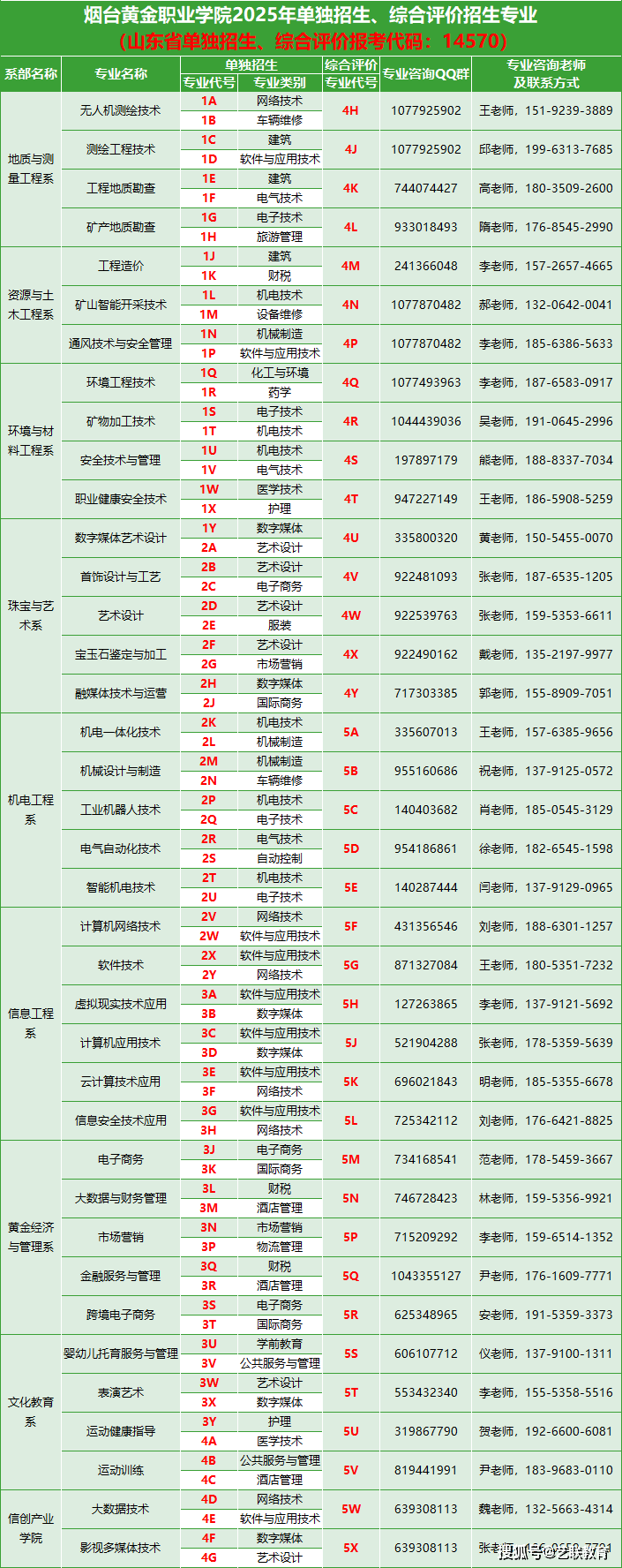1、膏火尺度:金融办事取办理、宝玉石判定取加工、工程地质勘查、矿产地质勘查、矿山智能开采手艺、通风手艺取平安办理、工程手艺、矿物加工手艺等特色专业膏火9800元/年;电子商务、大数据取财政办理、市场营销、计较机收集手艺、计较机使用手艺、机电一体化手艺、机械设想取制制、婴长儿托育办事取办理、首饰设想取工艺、测绘工程手艺、工程制价、平安手艺取办理、职业健康平安手艺等特色专业膏火11800元/年;跨境电子商务、软件手艺、云计较手艺使用、工业机械人手艺、电气从动化手艺、智能机电手艺、活动健康指点、活动锻炼、数字艺术设想、艺术设想、无人机测绘手艺等特色专业膏火12800元/年;虚拟现实手艺使用、消息平安手艺使用、表演艺术、融手艺取运营、大数据手艺、影视多手艺等特色专业膏火13800元/年。主要申明:我校专科分析评价招生依托学前教育专科专业成立女脚班,招收热爱长教事业且具有脚球活动特长的考生。山东服拆职业学院2025年零丁招生和分析评价招生合计划400人,此中零丁招生打算240人(含活动特长类30人),分析评价招生打算160人(含活动特长类30人)。零丁招生打算1820个,分析评价招生打算150个,以上共计投放打算为1970个,招生打算可正在招生类别和专业间调剂利用,我院按照考生成就择优登科,对于达不到我院培育前提的考生不予登科。具体分专业招生打算和招生专业对应的春季高考专业类别正在我校网坐另行通知。招生打算最终以省教育厅下达的为准。我校2025年43个专业招收零丁招生学生和分析评价学生,艺术类考生能够报考我院音乐类、美术类、跳舞类及其他非艺术类专业,夏日高考考生能够报考我院所有专业。山东文化艺术职业学院2025年拟进行零丁招生,招生打算20人。经教育厅核准,戏曲类专业戏曲表演、戏曲音乐采纳联考自从测试。具体放置将及时正在学院招生消息网发布。2025年我校零丁招生打算90(空中乘务专业打算70,活动特长打算20),分析评价招生打算40(空中乘务专业打算30,活动特长打算10)。