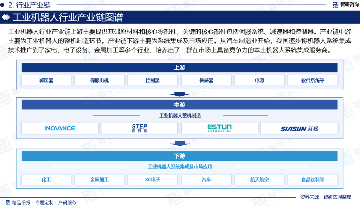 工业机械人行业财产链可分为上逛机械人根本原材料取焦点零部件、中逛机械人零件制制和下逛机械人系统集成及使用等三大财产链环节。财产链上逛次要供给根本原材料和焦点零部件,环节的焦点部件包罗伺服系统、减速器和节制器,它们间接影响着机械人的机能、这些部件形成了工业机械人的焦点手艺,是整个财产链中手艺难度最高的一环,也是中国机械人财产将来成长的环节冲破点。
