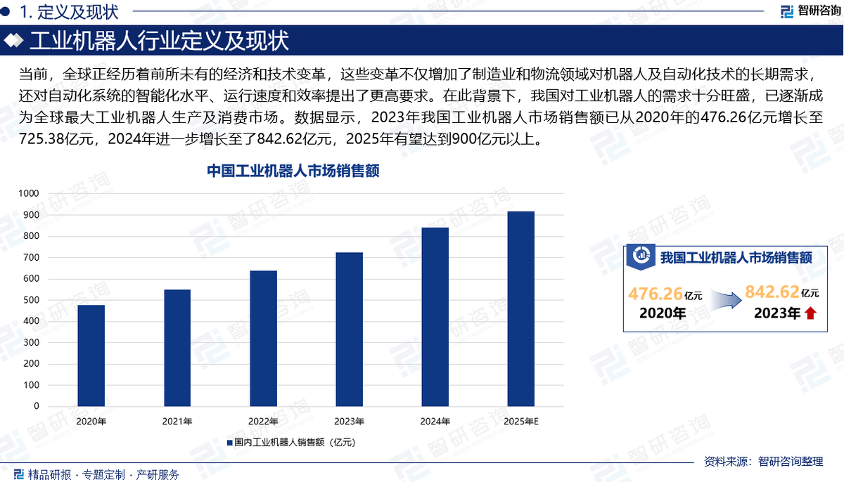 当前,全球正派历着史无前例的经济和手艺变化,这些变化不只添加了制制业和物流范畴对机械人及从动化手艺的持久需求,还对从动化系统的智能化程度、运转速度和效率提出了更高要求。正在此布景下,我国对工业机械人的需求十分兴旺,已逐步成为全球最大工业机械人出产及消费市场。数据显示,2023年我国工业机械人出产规模为42。95万套,2024年1-11月已达到48。39万套。从市场规模看,2023年我国工业机械人市场发卖额已从2020年的476。26亿元增加至725。38亿元,2024年进一步增加至了842。62亿元,2025年无望达到900亿元以上。
